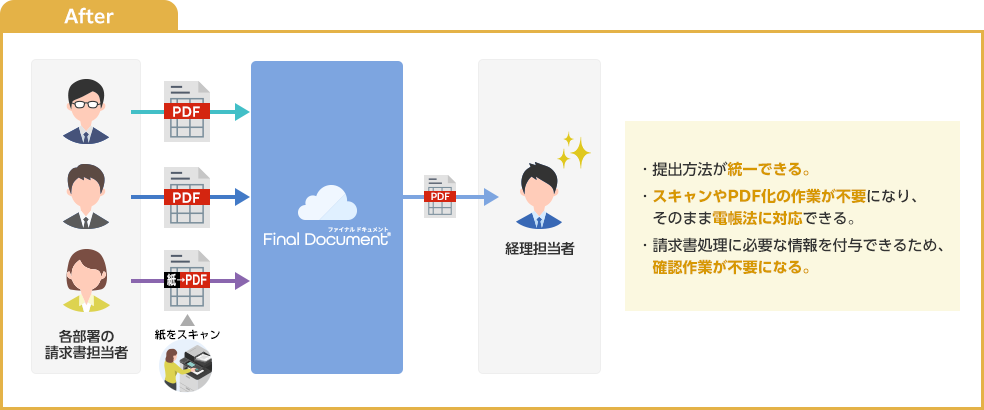 「Final Document」を導入することで提出方法を統一できます。電帳法にも対応するため、経理担当者の業務負担を削減できます。