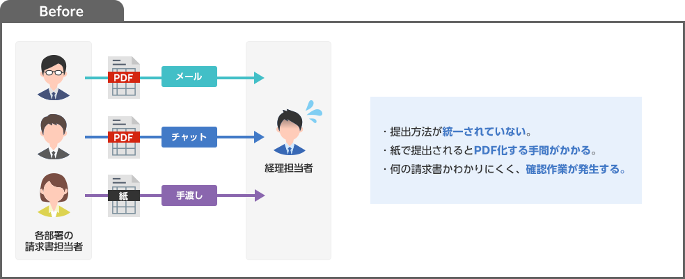 請求書の提出方法が統一されていない場合、請求書を処理する経理担当者には毎月多くの手間と負担がかかります。