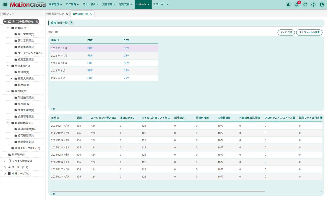 | 報告日報一覧 | クライアントPC管理のために、管理者が日々最低限確認するべき情報のみを抽出して表示 |