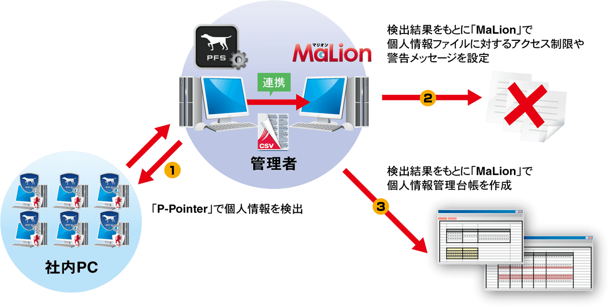 個人情報検出・管理ソリューション「P-Pointer File Security」と連携し、各端末上に存在する個人情報ファイルを自動で検出できます。検出したファイルに対する操作を制御することで、重要情報の不正利用や持ち出しを防止し、適切な情報管理を実現します。