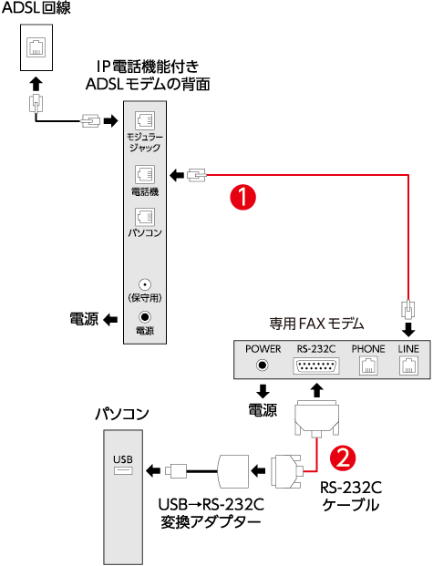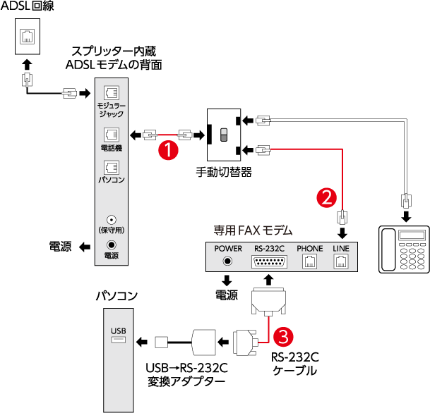 図中の黒線、赤線、番号はFAX通信するために必要な配線とその手順です。白線は必要に応じて接続します。