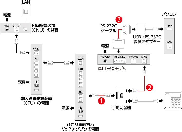 ※図中の黒線、赤線、番号はFAX通信するために必要な配線とその手順です。白線は必要に応じて接続します。