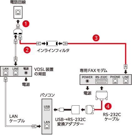※図中の黒線、赤線、番号はFAX通信するために必要な配線とその手順です。白線は必要に応じて接続します。