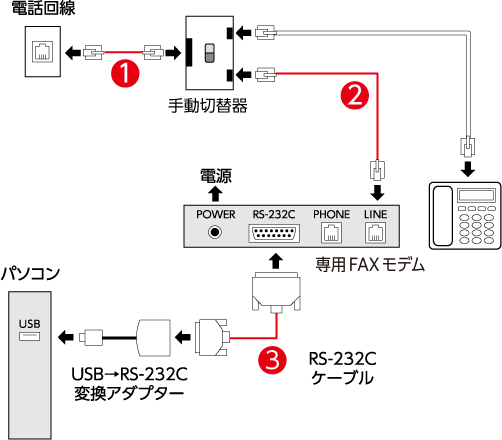 外付けFAXモデム+手動切替器接続例