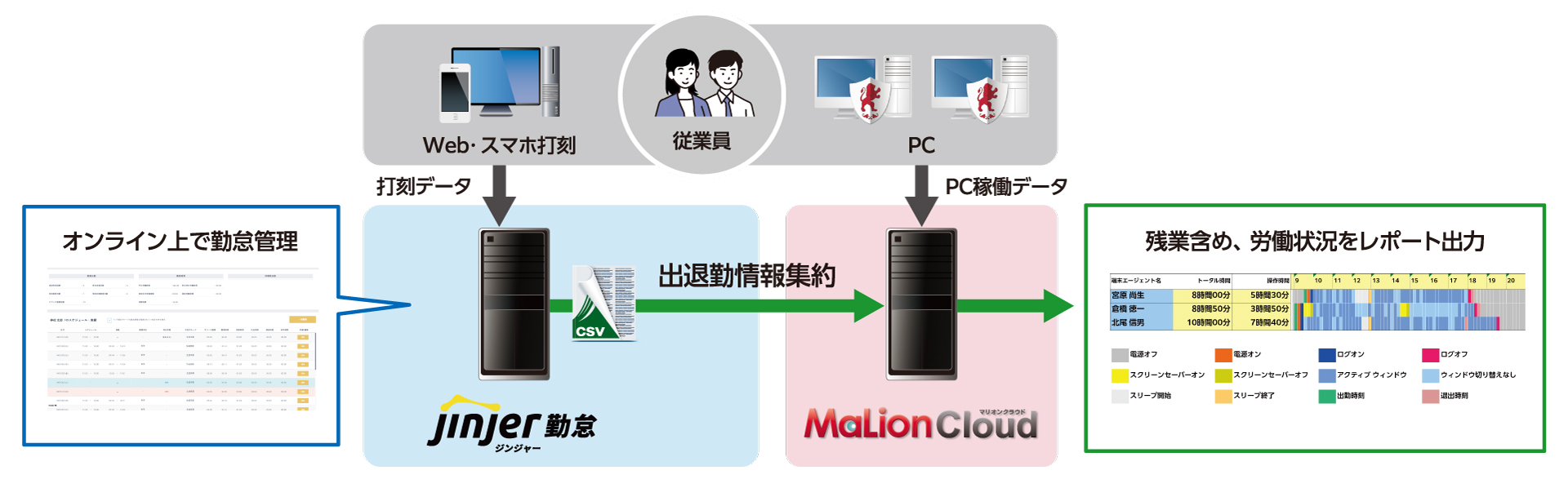 ![]() 「ジョブカン勤怠管理」との連携による「MaLionCloud」労務管理支援機能の概要図 |