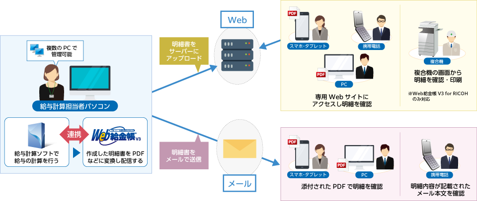複合機からも明細を取得したい場合は「Web給金帳V3 for RICOH 給与大臣版」で対応します。PDF化した明細書データを、インターネットを利用して社内および遠隔地の事業所に設置した複合機に配信できます。社員は近くの複合機を操作して給与明細を確認・印刷することが可能です。